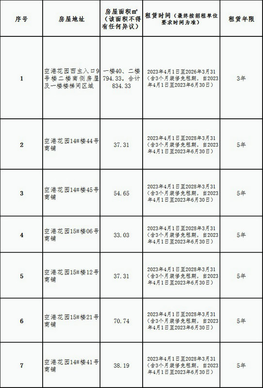 八、中标人及直接委托人定义:每一个竞拍周期报名结束后,有三个及以上报名人,将按照本公告规定的竞拍规则进行公开竞拍;当报名人数少于3人,则本次招租失败。若连续二次招租失败,在第三次竞拍报名期间(累计前2次)只有2人报名时,经招租人批准后,可采取现场比价方式,但不得低于招租底价;若只有1人报名时,经招租人批准后,可采取直接委托方式,委托租金单价空港花园西主入口9号楼二楼南侧房屋及一楼楼梯间区域为20元/㎡/月;空港花园14#楼44号商铺为41元/㎡/月;空港花园14#楼45号商铺为40.5元/㎡/月;空港花园15#楼06号商铺为32.5元/㎡/月;空港花园15#楼12号商铺为20.5元/㎡/月;空港花园15#楼21号商铺为31元/㎡/月;空港花园14#楼41号商铺为27.5元/㎡/月。本次竞拍只承认第一中标人,不按排名顺延中标人权利。