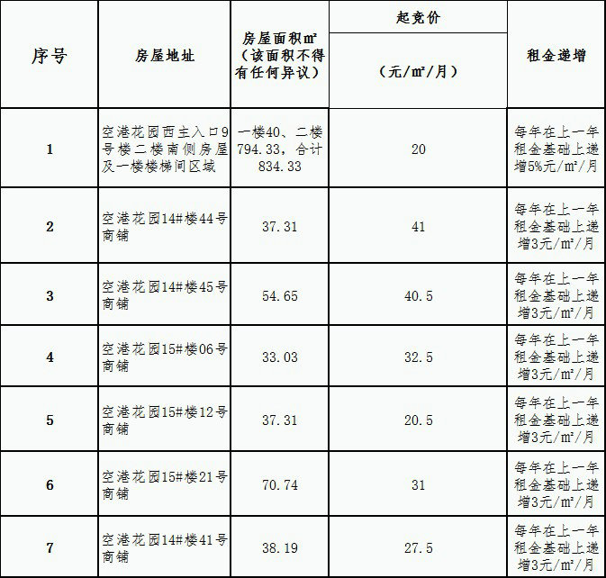 首次叫价为增幅后报价(即空港花园西主入口9号楼二楼南侧房屋及一楼楼梯间区域不低于20.5元/㎡/月;空港花园14#楼44号商铺不低于41.5元/㎡/月;空港花园14#楼45号商铺不低于41元/㎡/月;空港花园15#楼06号商铺不低于33元/㎡/月;空港花园15#楼12号商铺不低于21元/㎡/月;空港花园15#楼21号商铺不低于31.5元/㎡/月;空港花园14#楼41号商铺不低于28元/㎡/月),每次报价增幅最低不低于0.5元/平方米/月的整倍数,如出现竞拍人仅举牌不叫价情况,即默认为在上一轮叫价基础上增加0.5元/平方米/月,否则应价无效。当最高价(超过底价)未有人追加竞价时,主拍人对该价重复三次报价,第三次重复报价无人应价,由主拍人宣布成交。本次竞拍取达到底价的最高报价人作为中标人,中标人若放弃中标人权力,不按排名顺延中标人,我司将做废标处理。