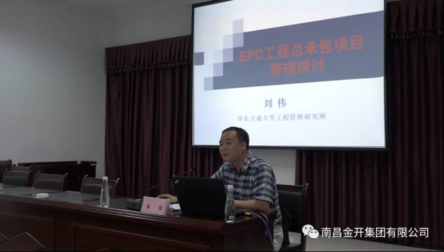为加强对“EPC”工程总承包项目管理理论知识的学习,提升金开江南(中国)工程人员专业技术水平。8月23日晚7点,金开江南(中国)“EPC”项目管理临时党支部邀请了华东交通大学工程管理研究所党支部书记刘伟博士,在金开江南(中国)下属市政公司一楼大会议室举办了“EPC工程总承包项目管理”专题讲座。江南(中国)副总经理袁扣华、熊爱华,项目公司副总经理李晖,江南(中国)工程部,各子公司工程部、前期部、质安部、技术部全体人员参加学习。