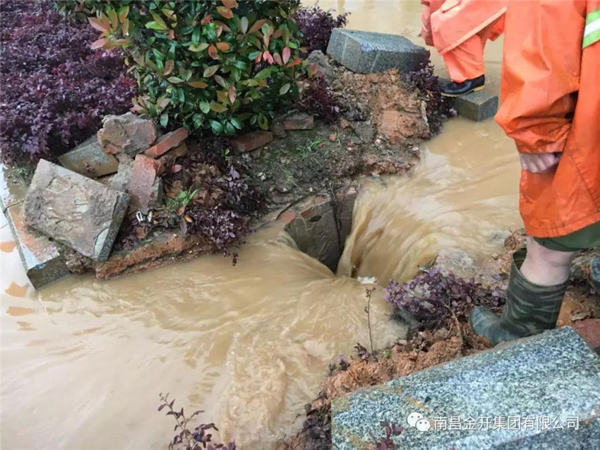 5月1日,南昌市突降暴雨,由于雨量大且急,导致区内各主干道排水压力剧增,多处道路出现积水、井盖冒水等现象,其中玉屏东大街、双港西路积水较为严重。为了保障行人、车辆出行安全,金开江南(中国)下属管护公司立即启动防汛应急预案,开展防汛排涝工作。