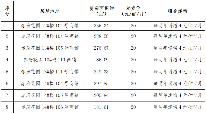 为提高国有资产经营效益,我司就南昌经济技术开发区赤府花园安置房小区12#楼1间、13#楼4间、14#楼3间共计8间商铺对外公开进行出租经营权竞拍,现对有关事项公告如下: 一、本次竞拍承包的房屋如下: