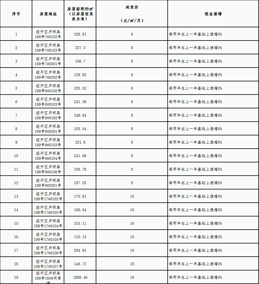 3、根据房屋信息表编号按顺序招租(原则上不隔开租赁),且所有商务条件均优先于承租面积大的承租户,以缴纳相应保证金时间排序。