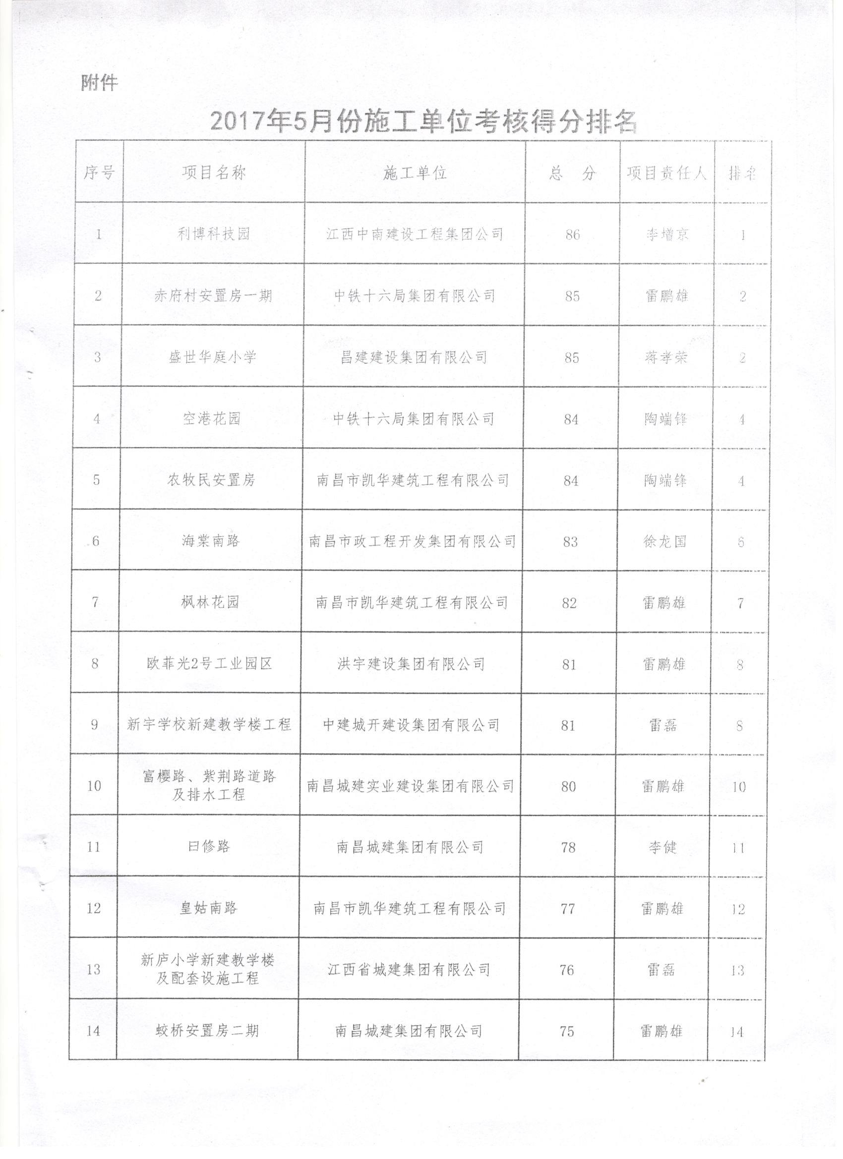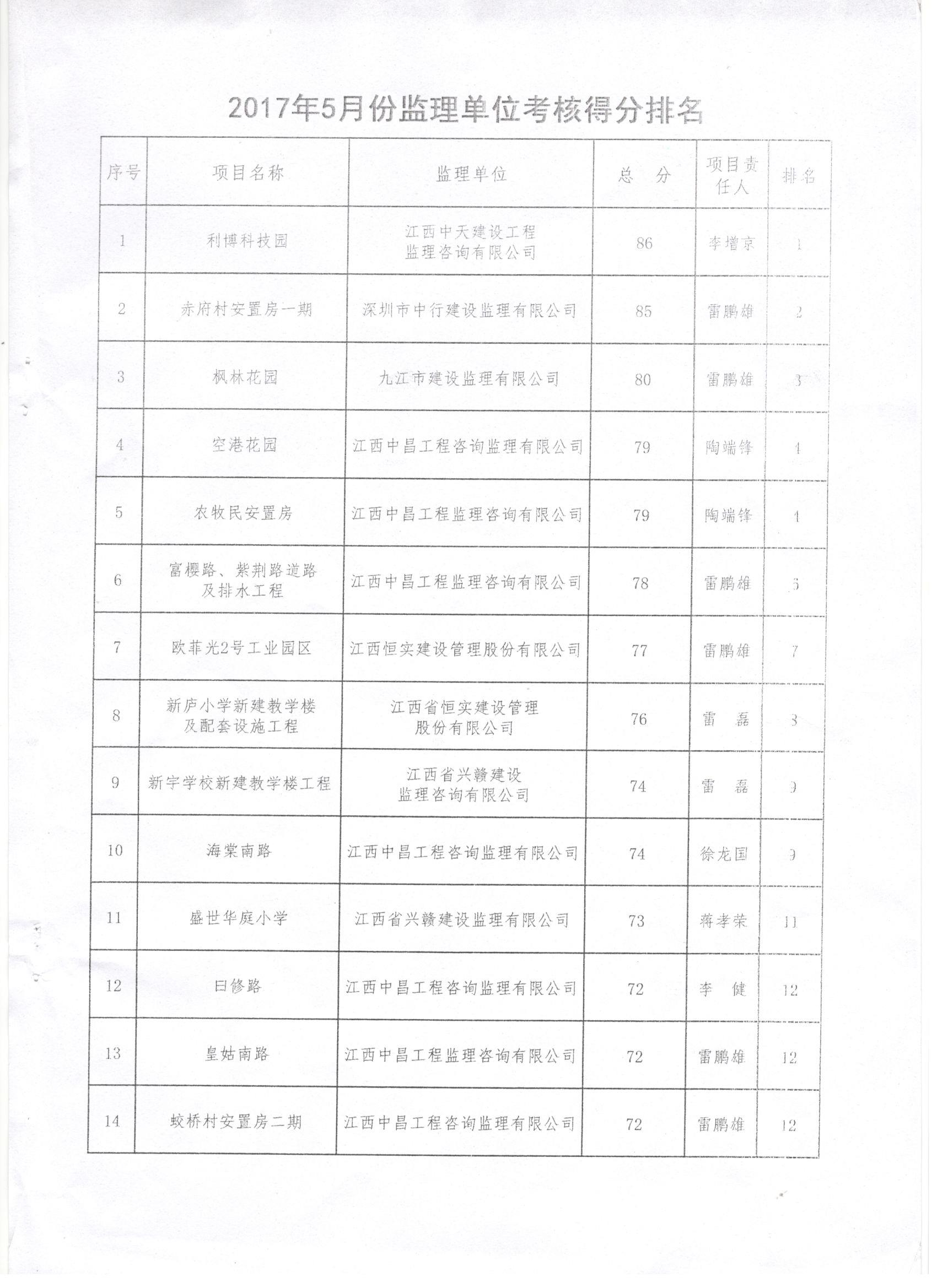 金开江南(中国)2017年5月施工、监理考核公布啦!