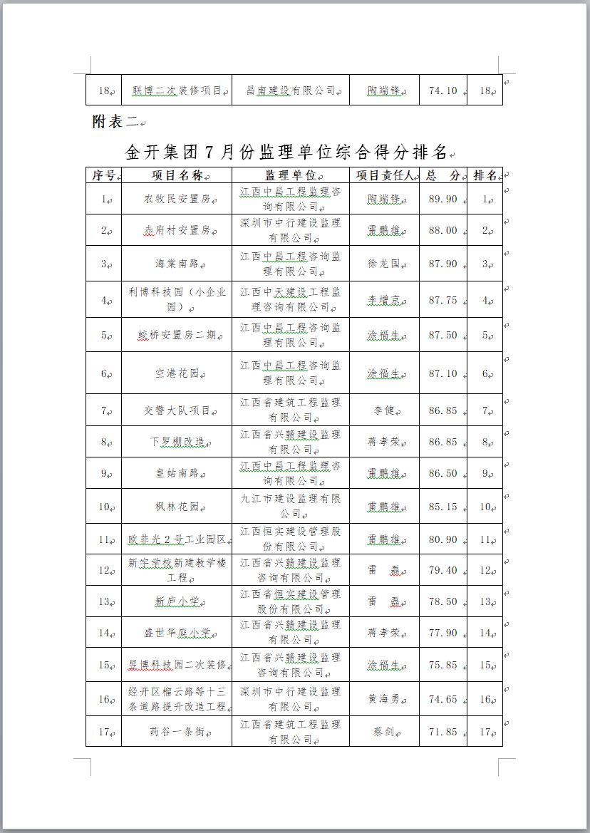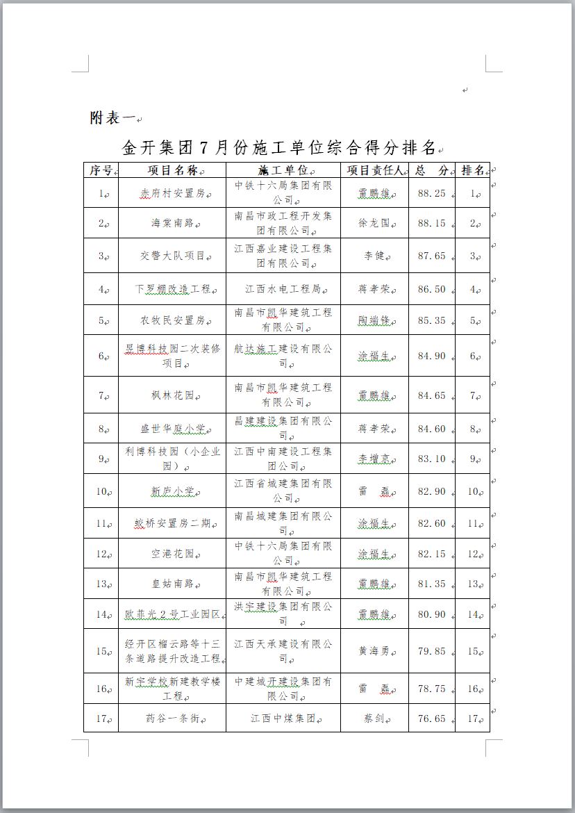 金开江南(中国)在建项目2017年7月施工、监理单位考核排名通报