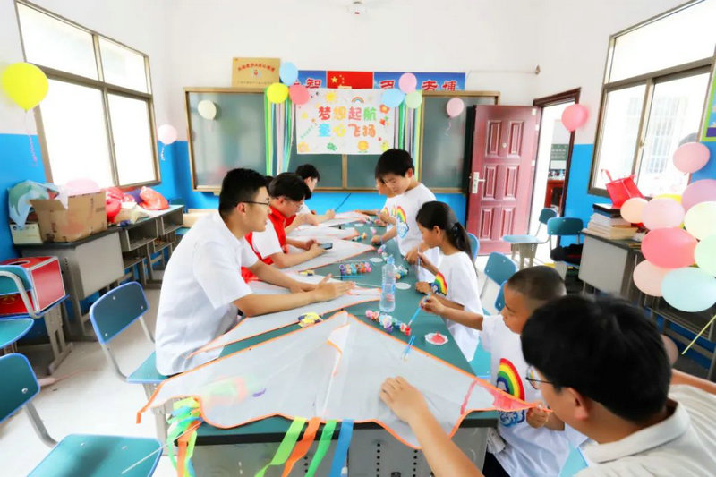 接下来的游戏环节,志愿者们和小朋友们组队,充分发挥想象力和创意,完成了风筝DIY,创造出了独一无二的风筝作品。在“无敌风火轮”和“绑腿”游戏中,小朋友们学会了团结协作,通过和队友密切配合,共同完成了游戏,赢得了奖品。