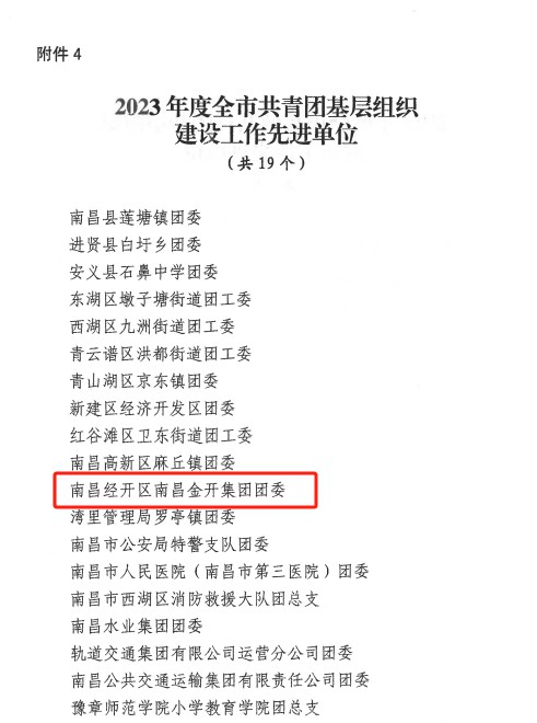 4月2日,共青团南昌市委对2023年度全市共青团工作评议情况进行通报,南昌金开江南(中国)团委荣获“2023年度全市共青团基层组织建设工作先进单位”称号。