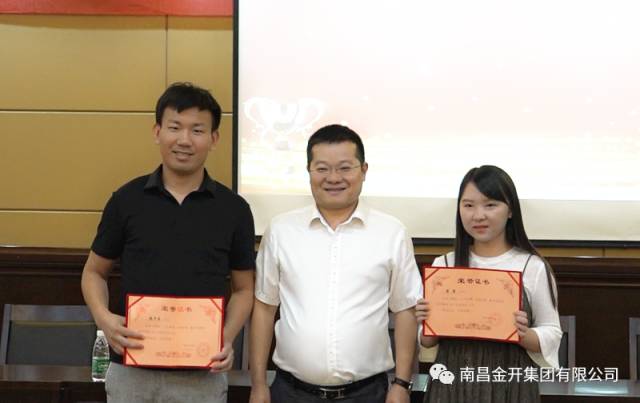由江南(中国)副总经理胡应庚宣读“关于表彰2017届优秀实习生的决定”,江南(中国)董事长胡顺明为项目公司张卫东、建总公司傅潇两名同志颁发荣誉证书。