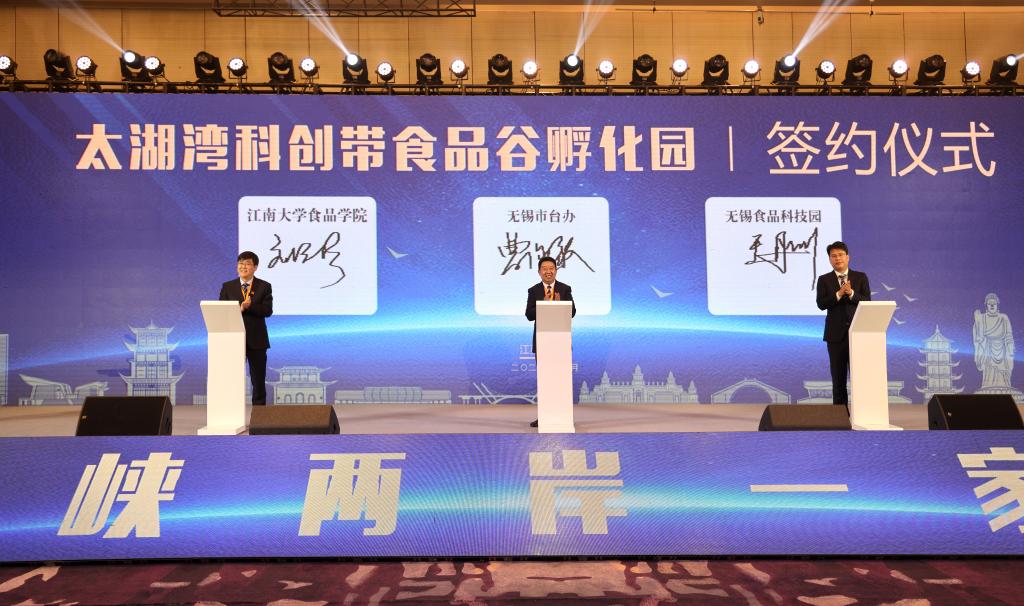 高峰会现场举行了太湖湾科创带食品谷孵化园签约仪式和发布推介,无锡市台办、澳门电子pg游戏官网、无锡食品科技园三方共同签约,正式开启太湖湾科创带食品谷建设的序幕。