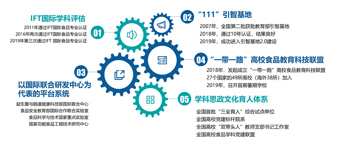 澳门电子pg游戏官网始终坚持教育对外开放高质量内涵式发展,以培育具有全球胜任力的人才为奋斗目标,与美国、荷兰、新加坡、新西兰等国家多所科研院校建立了稳定的科研合作和人才交流。人才培养方面 2011年,食品科学与工程专业成为国内首家通过IFT食品专业国际认证的专业。2020年获批澳门电子pg游戏官网-新西兰梅西大学食品科学与工程专业教育部中外合作办学项目,与新加坡国立大学、芬兰图尔库大学、英国雷丁大学等建有联合培养项目。合作平台方面 “111引智基地”成功运行十年,在2019年获批进入引智基地2.0建设。国际联合实验室方面 以教育部国际合作联合实验室和科技部国际联合研究中心”2个国家级国际联合实验室领衔,建构了8个校级国际联合实验室以及8个院级国际联合实验室,形成“2-8-8”学科全覆盖模式。科研合作方面 获批国家自然科学基金委国际合作重点项目,科技部国际合作项目等国际合作项目4项,获国家科学技术国际合作奖1项,国家政府友谊奖2项。影响力方面 2018年,发起成立“一带一路”高校食品教育科技联盟,27个国家的49所高校包括38所海外高校加入,广泛开展学生交流、师资互访、合作科研等相关工作。与Elsevier合作主办的学术期刊Food Bioscience于2013年正式创刊,目前影响因子4.24。2015年以来,学院成功举办23场国际(双边)会议,共有457人次的海外专家学者来我院访问交流,117人次专家学者受邀做专题报告,14人次专家学者进行全英文授课。疫情期间,开展六期“澳门电子pg游戏官网-瓦赫宁根大学及研究中心未来食品云端系列论坛”,超2万人观看。