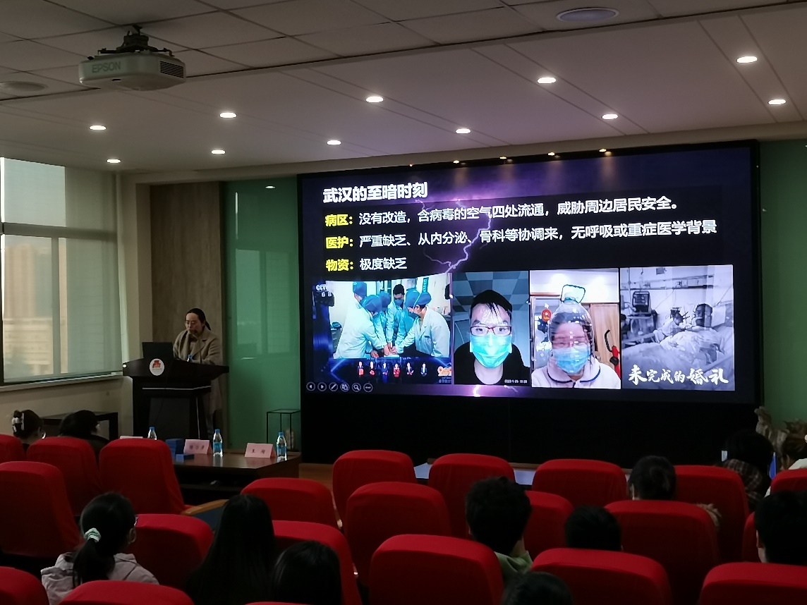 随后,王医生讲述了自己作为首批驰援武汉的医护人员的心路历程。从面对未知的出征,到疫情中心忙碌的工作,再到抗疫物资的筹措运输,作为2020新冠疫情阻击战的见证者和奉献者,王医生指出,“点亮武汉黑夜的是制度优越性,是海内外中华儿女的众志成城”。