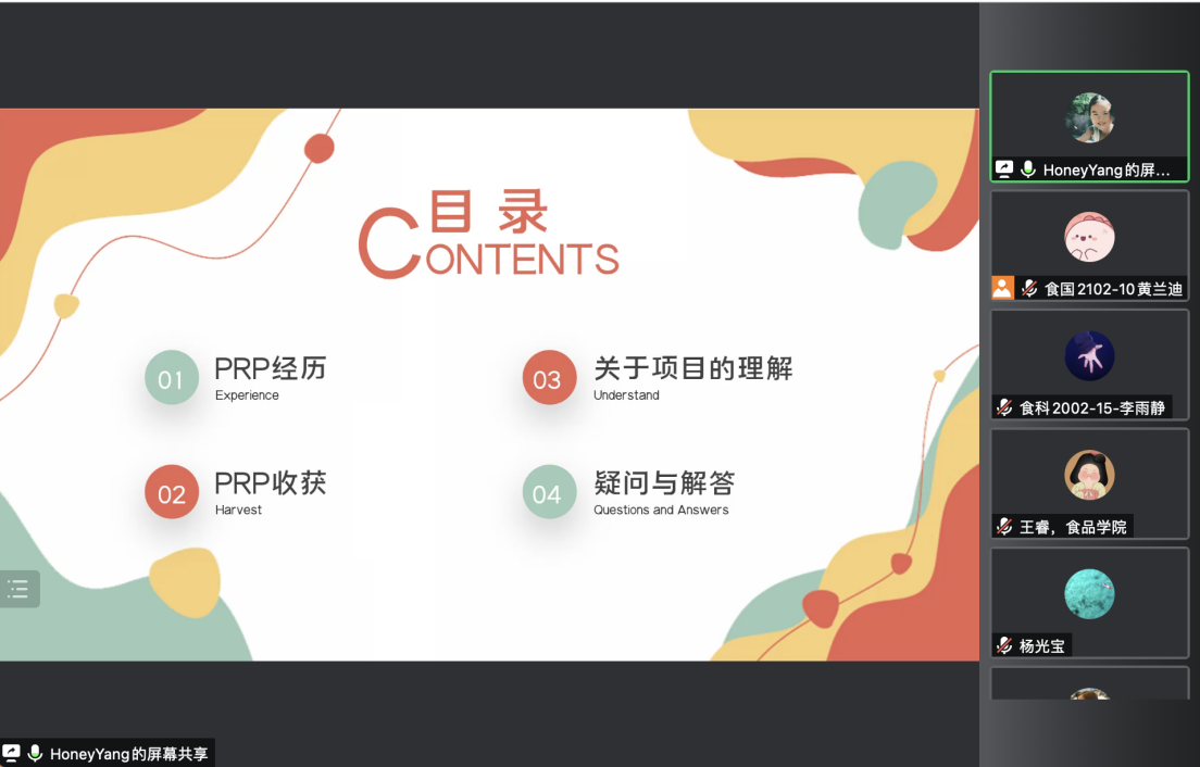 最后,往届参与PRP同学分享经验。2020级研究生杨晗婕有着本科和研究生的两次PRP项目经历,她将PRP项目概括为一次体验和一次预习。通过PRP项目可以尝试感兴趣的研究方向,为科研之路作准备,提前适应实验室环境。