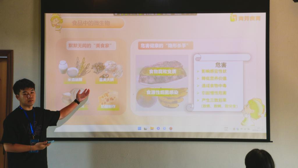 “为什么新鲜面包放进冷藏室,拿出来却不好吃了呢?”“为什么妈妈要将蔬菜和水果分开放呢?”一堂生动有趣的食育课在福鼎市乡村振兴工作站开讲,引发现场多名中小学生的踊跃问答,也让他们对食品,对人体与微生物有了更多的了解和认知。课堂上,实践团成员结合福建当地饮食特点,通过丰富的案例带领青少年们走入美味的食品世界,助其认识饮食与健康的关系,树立正确的膳食营养观念。