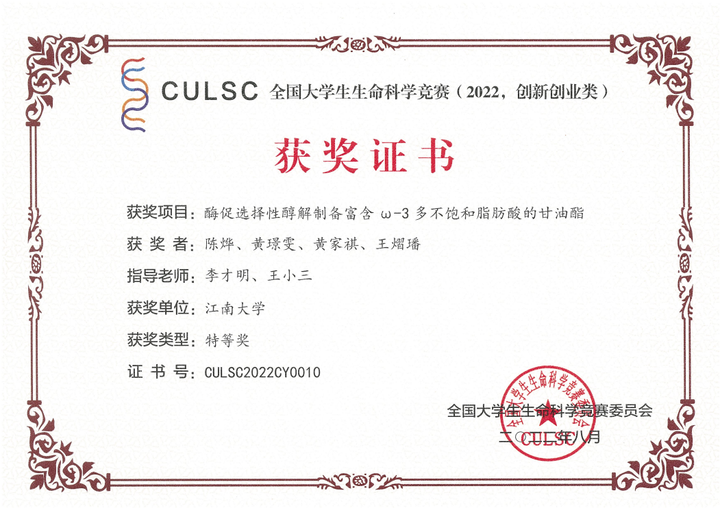 此次我院共有34个项目参赛,14个项目获奖。其中,由李才明与王小三老师共同指导,陈烨等同学参赛的项目《酶促选择性醇解制备富含ω-3多不饱和脂肪酸的甘油酯》一举夺得创新类全国特等奖。