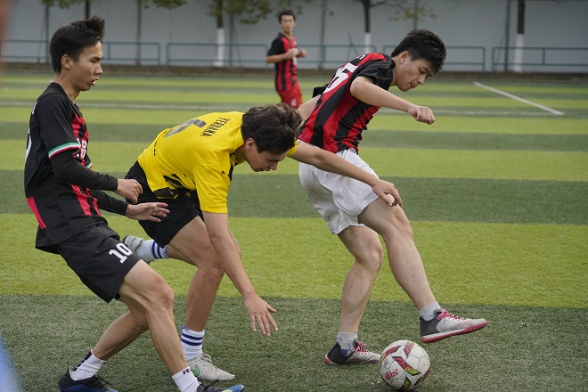 被红牌罚下一名后卫大将,7人应战的食外联队组织教练组立即进行战术研讨,面对少打一人的场面,针对性布置落位和防守。在李金杰老师的带领下,现场近百位队员和观众发挥了“球队第12人”的关键角色,为场上运动员们加油助威和拼命呐喊,经过队员们积极的奔跑、顽强的拼抢和舍命的封堵,食外联队将比分最终维持在2:2,比赛拖入紧张窒息的点球大战。在点球大战中,两队球员们冷静施射,前四罚均稳稳命中,第五轮点球中,门神王骁神勇扑出对方点球,王腾宇一蹴而就罚进最后点球,食品外语联队5:4夺冠捧杯。