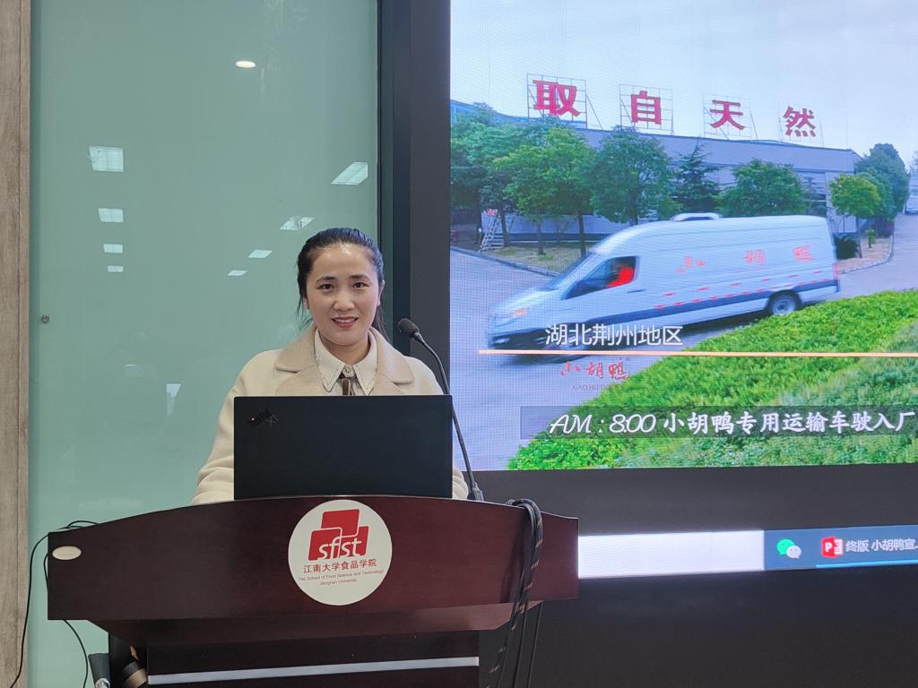 胡秀容为同学们分享了她和家人共同创业的历史,表达了对食品专业青年学子的极大期待。她希望在座的食品学子都可以通过自己的努力“做一只有故事、有思想、有文化、有激情、有红色基因、有科技含量的小胡鸭”。