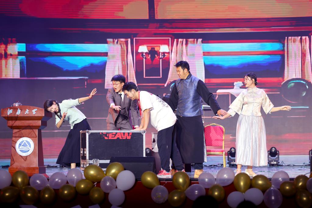 第三篇章“绽放”以缘韵笛箫社的器乐演奏《敕勒歌》开场。种子话剧团演绎的《青春》以生动的情节和真挚的情感打动了在场的每一个人。澳门电子pg游戏官网2024级新生合唱团带来的《请党放心,强国有我》真挚而嘹亮,展示了当代青年的风采与担当。一首独唱《梨花又开放》让观众们忆及年少时的欢笑与泪水。学生会同学演唱的歌曲串烧《小镇·夏天·朋友》带大家重温经典,赢得掌声连连。