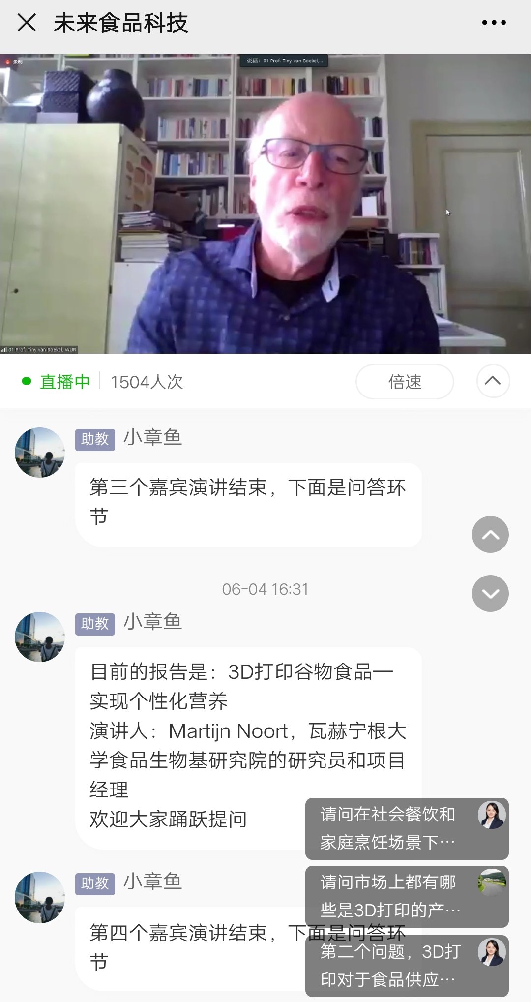 2020年6月4日,“澳门电子pg游戏官网-瓦赫宁根大学及研究中心未来食品云端系列论坛”第二期期会议隆重举行并取得圆满成功。在首期论坛的基础上,本期论坛的筹备总结了前期工作的经验与不足,优化了流程,成功吸引了来自国内外1700多名专家、学者和同行等的积极参与。本次会议仍然采用网络直播的形式举行,围绕“食品3D打印”这一国际前沿性话题展开研讨。出席本次会议的嘉宾主要有荷兰瓦赫宁根大学及研究中心Maarten Schutyser教授、Martijn Noort研究员以及浙江大学贺永教授和澳门电子pg游戏官网张慜教授。此外,本次会议有幸邀请到了国际食品科学领域专家、来自瓦赫宁根大学及研究中心的Tiny van Boekel教授出席并主持了会议。