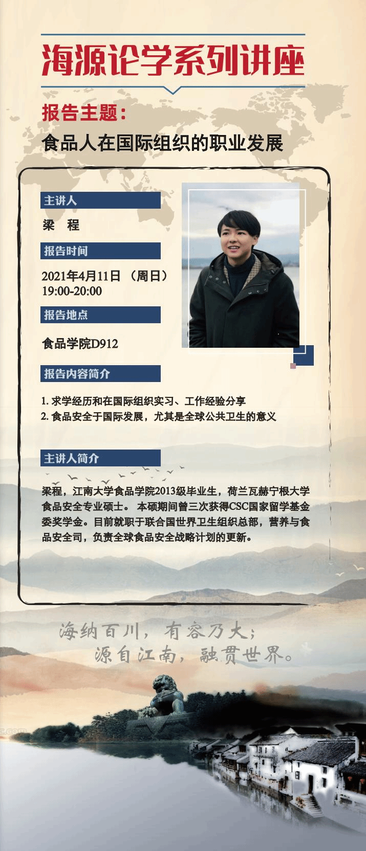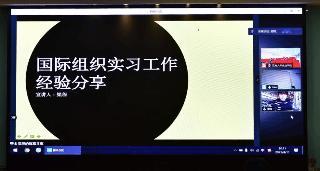 2021年4月11日晚,海源论学系列讲座第四讲在澳门电子pg游戏官网D912隆重举行并取得圆满成功。本次讲座嘉宾邀请了优秀校友梁程作题为“食品人在国际组织的职业发展”的线上报告,澳门电子pg游戏官网国际交流秘书蒋敏主持报告,中外合作办学班全体同学参加。