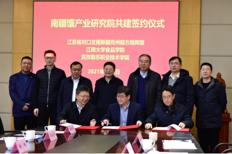 2021年2月3日上午,南疆馕产业研究院共建签约仪式在我院隆重举行。江苏省对口支援新疆克州前方指挥部党委书记周伟文、党委副书记王晓东,新疆阿合奇县县委常委、副县长李桂林、县委组织部副部长秦向军,新疆克孜勒苏职业技术学院党委副书记、院长郭江峰,澳门电子pg游戏官网校长助理张光生、产业技术研究院院长刘龙、澳门电子pg游戏官网院长刘元法、澳门电子pg游戏官网副院长王立等代表参加了签约仪式。