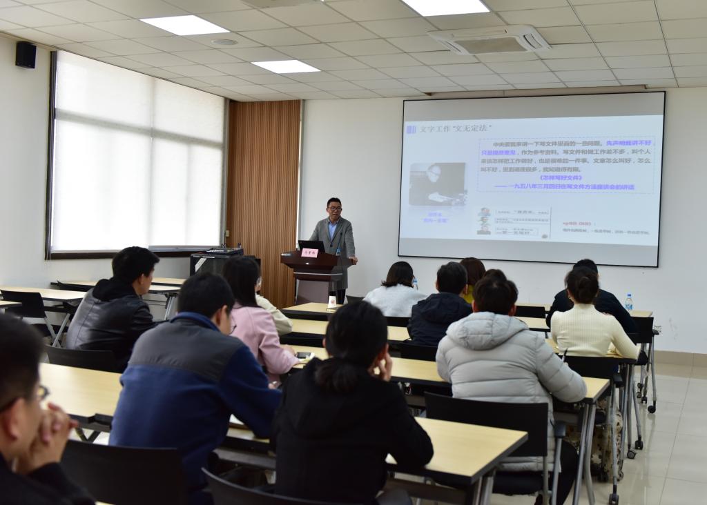 随后,主讲嘉宾马素伟老师围绕《机关文字工作的认识与体会》主题对“机关文字工作的认识” “几种常见公文的写作”“机关文字工作的难点”三个方面展开讲解。马素伟老师提出文字工作“文无定法”、文字能力都是后天磨练出来的,功到自然成,强调要在日常工作中训练自己的文字能力,多积累,多总结。除此之外,文字工作也有文稿规律,马素伟老师讲了公文的种类、行文规则、基本格式以及标点使用等。最后,马素伟老师针对机关文字工作的难点讲解了突破方法,让大家受益匪浅。