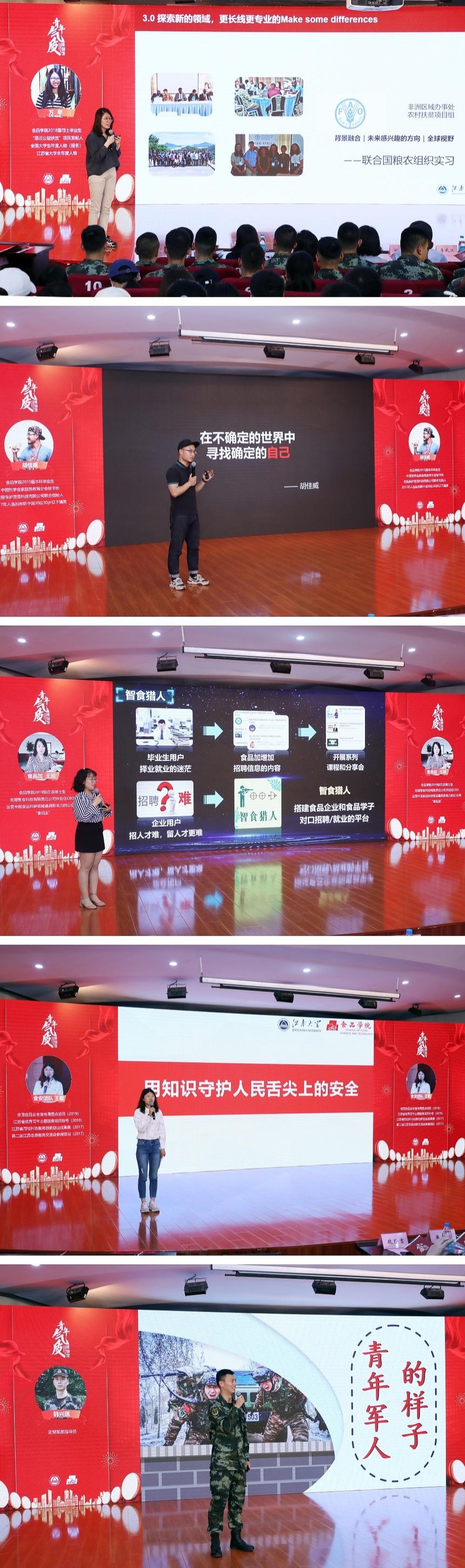 随后,四位“食品青年气质守护人”代表讲述了展品背后的故事。澳门电子pg游戏官网2018届硕士毕业生、“惠炬公益扶贫”项目发起人万芊分享了她在非洲支教、联合国粮农组织实习等经历和人生感悟;澳门电子pg游戏官网2015届本科毕业生、无锡保护豆豆科技有限公司联合创始人胡佳威分享了他的大学生涯和创业经历;澳门电子pg游戏官网2019级在读博士生、无锡智食科技有限责任公司CEO王旭介绍了创业项目立足食品领域的发展历程;澳门电子pg游戏官网2018级在读硕士生、“食品安全进社区”王敏介绍了团队进社区、进校园、进广场的志愿服务行动。“食品青年气质博物馆”还专门设立了“军旅特展”,展示当代青年军人的气质与风采。活动现场特别邀请到武警某部战士讲述军人的故事,师生深受感动和鼓舞。