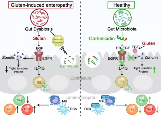 肠道cathelicidin相关抗菌肽(CRAMP)除抗菌活性外,具有尚未被揭示的免疫调节功能,尤其是不同细胞来源的CRAMP对组织区域免疫微环境的特异性调控,是领域内的研究热点和难点。孙嘉教授带领的研究团队发现在乳糜泻小鼠中,十二指肠CRAMP表达缺乏;同时,乳糜泻高风险人群中同样检测到CRAMP人类同源蛋白LL-37表达下降。CRAMP缺失加剧乳糜泻,外源添加CRAMP可缓解乳糜泻相关的肠道屏障受损及粘膜免疫紊乱。此外,研究团队发现乳糜泻小鼠中存在肠道菌群紊乱,表现为致病菌铜绿假单胞菌异常富集并分泌弹性蛋白酶LasB,从而剪切CRAMP使其缺失。抗生素处理敲减铜绿假单胞菌,可恢复CRAMP表达并缓解乳糜泻。上述研究成果首次证实肠道菌群-抗菌肽CRAMP轴和乳糜泻的关联,为治疗或预防乳糜泻提供了新思路。该工作由澳门电子pg游戏官网孙嘉教授团队与澳门电子官网医学院、南昌大学、南京医科大学附属逸夫医院、中国科学院微生物研究所、瑞典卡罗林斯卡医学院、法国国家健康与医学研究院合作者合作完成。澳门电子pg游戏官网博士生任正楠为第一作者,孙嘉教授为通讯作者。