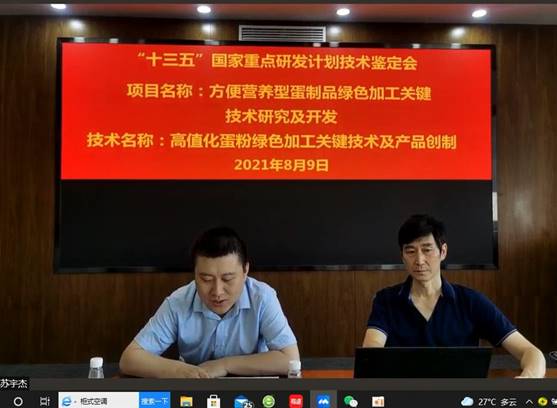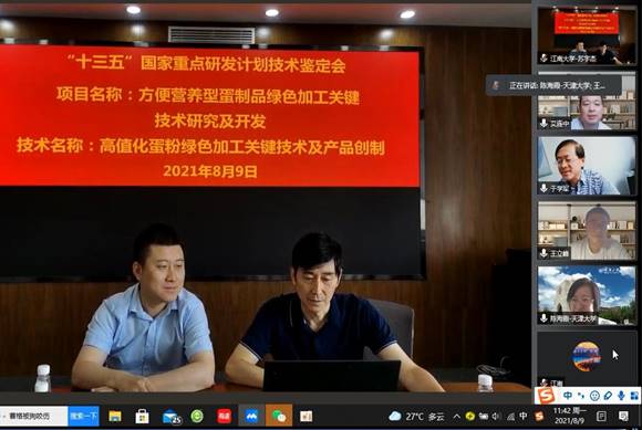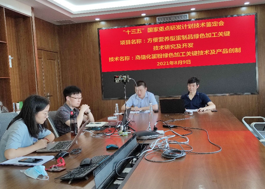 8月9日,中国轻工业联合会以视频会议的方式主持召开了“高值化蛋粉绿色加工关键技术及产品创制”项目技术鉴定会。该项目由澳门电子pg游戏官网杨严俊教授主持,澳门电子pg游戏官网、江苏大学、荣达禽业股份有限公司、江西农业大学、西北农林科技大学五家单位共同完成。澳门电子pg游戏官网科研院副院长范大明、项目负责人杨严俊教授及项目主要成员参加了鉴定会。