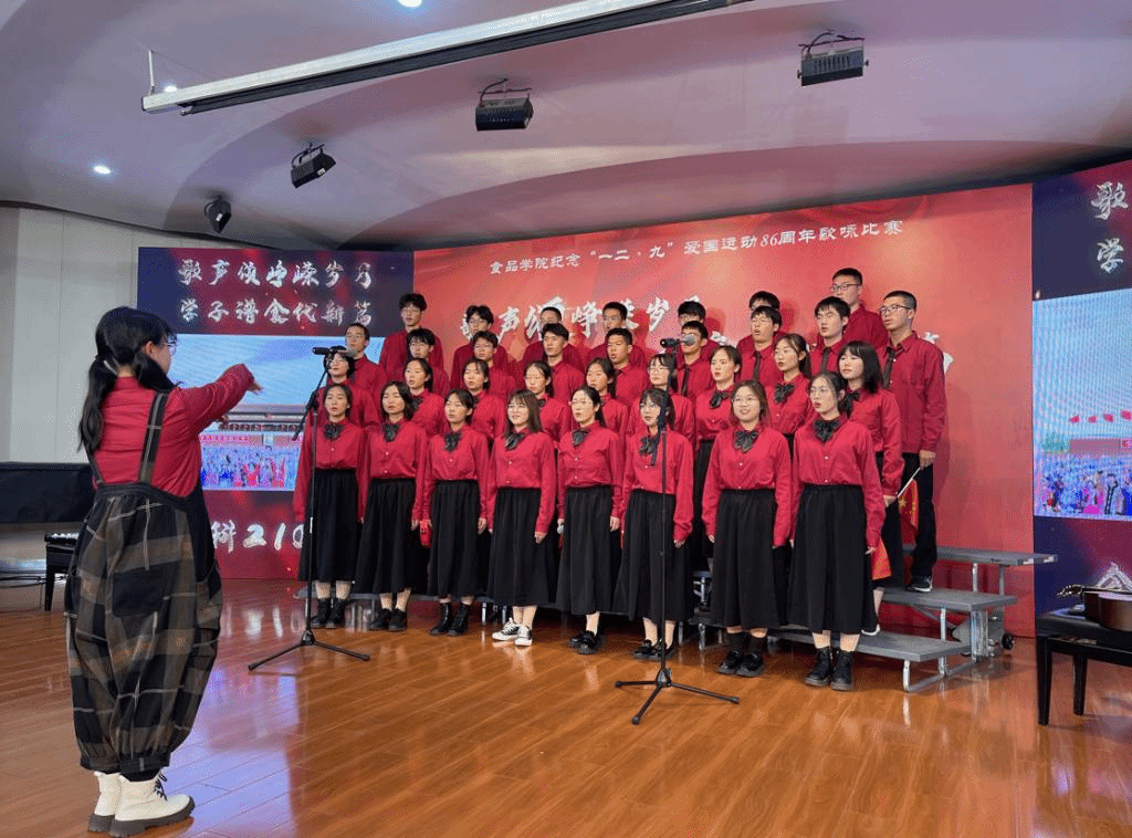 比赛现场,精彩纷呈。来自2021级的十支队伍为全场观众带来了二十首歌曲,学生用歌声、朗诵、舞蹈、乐器等表演形式深情演绎,唤起观众们对峥嵘岁月的深情回忆,展现出青春的激情和热血。“我们赞美长江,你是无穷的源泉;我们依恋长江,你有母亲的情怀……”食科国际2102班率先唱响,洪亮优美的歌声唱出了对长江的赞美与依恋。食科2013班意气风发、斗志昂扬,一首《没有共产党就没有新中国》唱出了对党的崇高敬意;食质2101班《我和我的祖国》深情嘹亮,唱出了食代学子最诚挚的赤子之心;食科2104班《走向复兴》激昂振奋,展现了中华儿女在复兴之路上的坚定信念;食科国际2101班《打靶归来》整齐划一、感情饱满,深情传唱人民军队的赞歌;食科2105班《我的中国心》气势饱满、热烈深沉,唱出了浓浓的家国之情;食质2102班一首《明天会更好》,乐曲宛转悠扬,声音抑扬起伏,催人奋进,鼓舞人心,唱出了自强不息、开拓进取的新时代强音。一首首激昂的歌曲,一声声响亮的誓言将比赛推向一个又一个高潮,引发现场观众强烈共鸣,收获阵阵掌声。