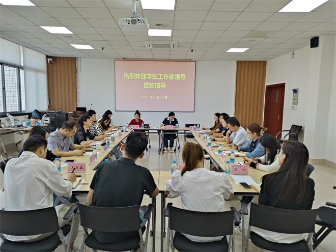 9月29日上午,学生工作处处长张菁燕,副处长李荣华、俞立峰,综合科科长糜海燕,心理健康中心曾艳一行前来我院开展调研。澳门电子pg游戏官网党委书记傅莉莉,副书记、副院长李雷,分团委书记、学工办主任朱伟及全体辅导员参加调研交流会。会议主要围绕思政教育、疫情防控、创新创业、应急处突等工作进行研讨。