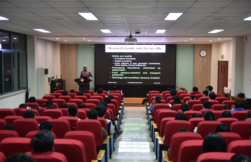 随后,澳门电子pg游戏官网邀请Niranjan教授在D912会议室举办“Food Science and Technology Research: Where from? And where to?”的学术讲座。讲座由澳门电子pg游戏官网院长助理徐勇将教授主持,近120名澳门电子pg游戏官网本科生参加了讲座。讲座伊始,徐勇将教授简单介绍了Niranjan教授的工作经历、教学领域及研究领域,并对此次教学活动表示感谢和热烈欢迎。讲座中,Niranjan教授重点介绍了自上世纪80年代至今的食品研究发展,围绕从食品保藏转变到食品品质与健康、从食品加工过程研究转变到产品开发研究、从以农业为核心的食品研究转变到以消费者为核心的食品研究等核心方面,深入分析了食品发展历史及未来趋势,同时指出了食品行业高质量发展的良好前景。接着,Niranjan教授和Qiaofen Cheng教授与同学们进行了良好互动沟通,对同学们提出的问题进行了详细解答,现场气氛热烈。最后,Niranjan教授对同学们提出了殷切的期望并表达了美好的祝愿,希望同学们充分认识食品行业的良好发展前景,不断开拓国际视野,刻苦钻研,学有所成。