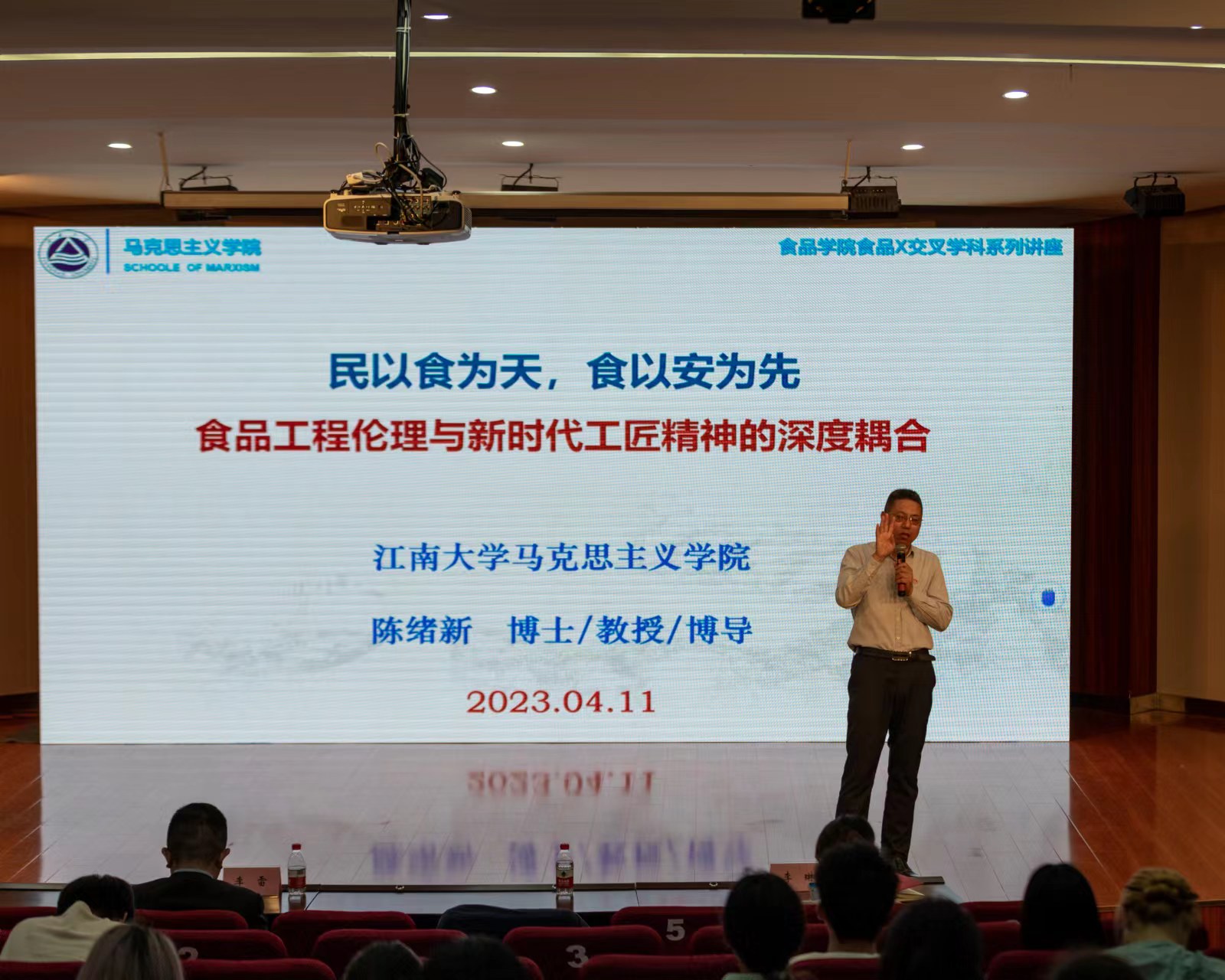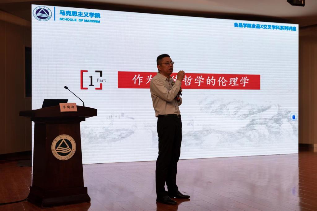 4月11日下午,“食品X”交叉学科系列讲座在北区大学生活动中心再次开讲。本次活动邀请到马克思主义学院博士生导师陈绪新教授作题为《民以食为天,食以安为先——实现食品工程伦理与新时代工匠精神的深度耦合》的报告。澳门电子pg游戏官网党委副书记、副院长李雷,分团委副书记李琳及380余名食品学子参加活动。2020级本科生辅导员王文燕担任主持。