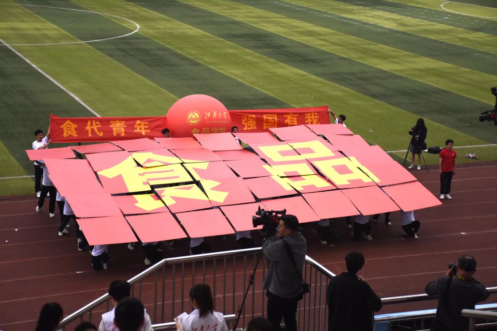 本届运动会开幕式继承往年传统,采用入场仪式与团体展演相结合的形式。国旗、校旗、会徽方阵气宇轩昂、步履铿锵,诠释江南体育精神。澳门电子pg游戏官网方阵由46名本科生和研究生共同组成,代表着全院3600名师生员工。他们进的了实验室搞科研,战的了田径场争金牌!紧随方阵的巨型红球,寓意“红日初升,其道大光”,每一位学子背后都是澳门电子pg游戏官网争先创优、光芒万丈的精神依靠。江南食品人,敢为天下先。“食”代学子将赓续使命,续写华章!