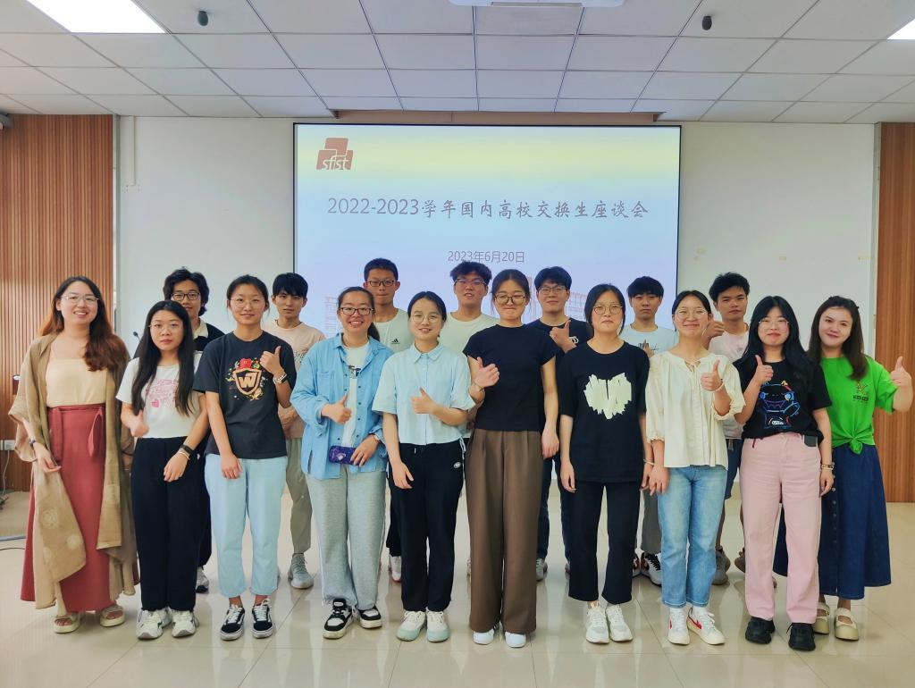 6月20日中午,澳门电子pg游戏官网2022-2023学年国内高校交换生欢送会在D916会议室顺利举行。学院党委书记傅莉莉、分团委副书记李琳、2021级本科生辅导员曹敏,以及来自国内两所高校的15名交换生出席活动。