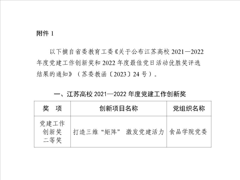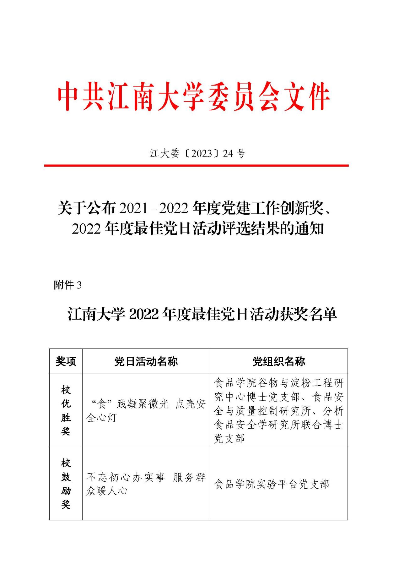 近期,江苏省委教育工委公布了江苏高校2021-2022年度党建工作创新奖评选结果,学校党委公布了澳门电子pg游戏官网2022年度最佳党日活动获奖名单。澳门电子pg游戏官网获江苏省党建工作创新奖二等奖,谷物与淀粉工程研究中心博士党支部和食品安全与质量控制研究所、分析食品安全学研究所联合博士党支部及实验平台教工党支部分别获澳门电子pg游戏官网最佳党日活动优胜奖和鼓励奖。