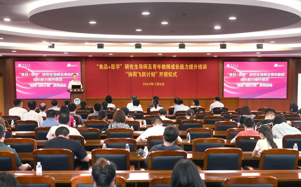 7月8-9日,澳门电子pg游戏官网“食品+医学”研究生导师及青年教师成长能力提升培训“协同飞跃计划”系列活动成功举办。8日下午,开班仪式在校图书馆五楼报告厅隆重举行。特邀专家同济大学校长郑庆华,澳门电子pg游戏官网党委书记朱庆葆,澳门电子pg游戏官网党委常委、副校长吴正国,研究生院院长吴小俊,澳门电子pg游戏官网党委书记傅莉莉,医学院党委书记向琪,澳门电子pg游戏官网院长范大明、副院长孙秀兰,医学院副院长柴高尚以及来自2个学院的150余名研究生导师出席活动。仪式由范大明主持。