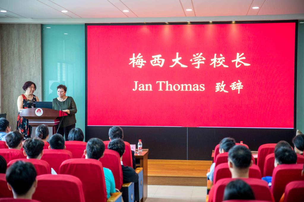 Jan Thomas对全体新同学通过自身努力入选中外合作办学项目表示由衷祝贺,并对家长们的培养与付出致以感谢。她表示,三年后的7月将在梅西大学的美丽校园亲自迎接各位学子。
