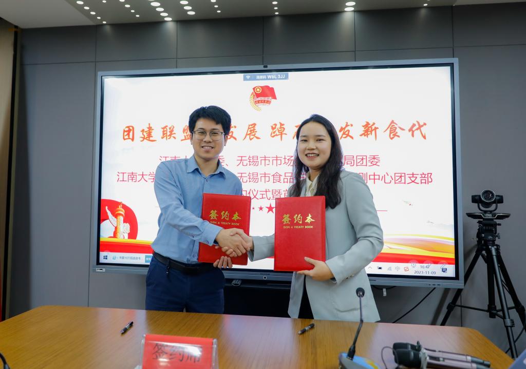 11月9日下午,澳门电子pg游戏官网与无锡市市场监督管理局、无锡市食品安全检验检测中心联合举办“团建联盟促发展,踔厉奋发新食代”团建共建签约仪式。无锡市市场监督管理局机关党委专职副书记倪凌燕、市场监管局团委书记季卓娅、无锡市食品安全检验检测中心副主任周宇、检验检测中心团支部书记陆佩瑶;澳门电子pg游戏官网团委副书记单云婷,澳门电子pg游戏官网党委副书记、副院长李雷,分团委书记李金杰等领导嘉宾及双方团员青年代表出席仪式。