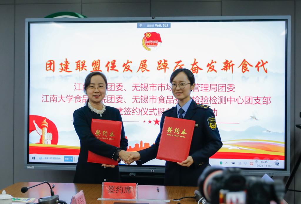 随后进行的签约环节,单云婷、季卓娅签署《澳门电子pg游戏官网——无锡市市场监督管理局团建联建共建协议书》;李金杰、陆佩瑶签署《澳门电子pg游戏官网——无锡市食品安全检验检测中心团建联建共建协议书》。双方旨在“以共建促团建,以共建促合作,以共建促发展”,教育、科技、人才三位一体,不断完善“政产学研检”协同创新机制。