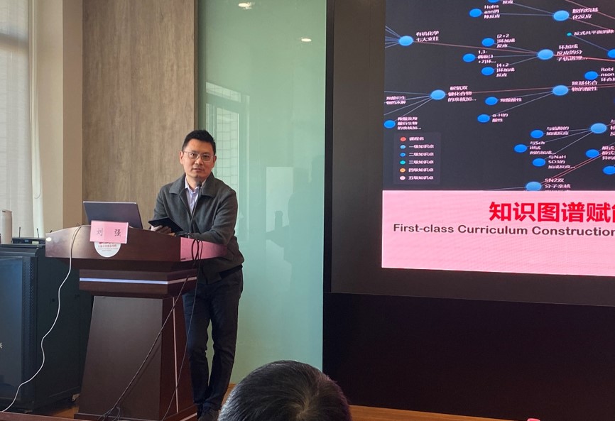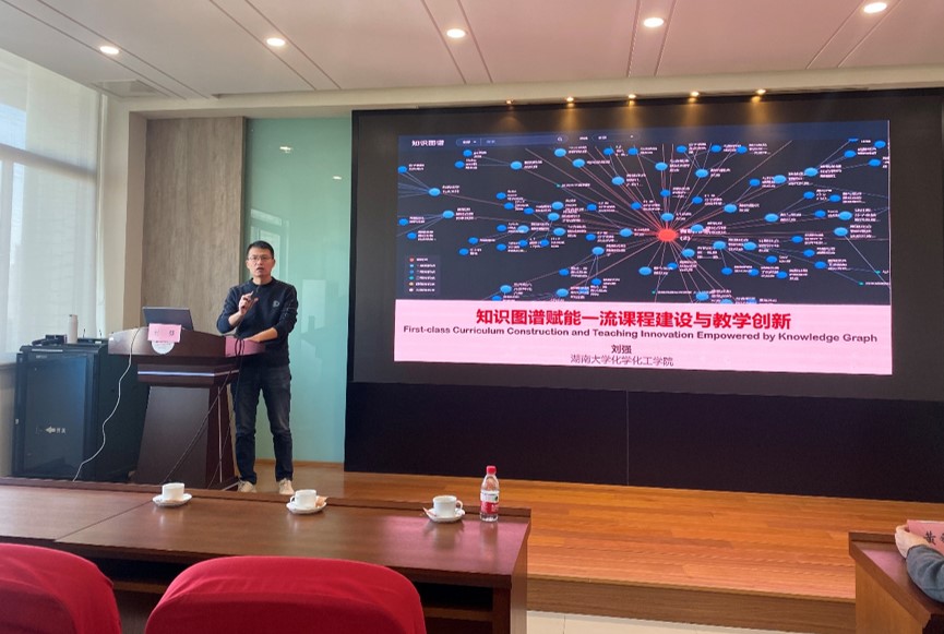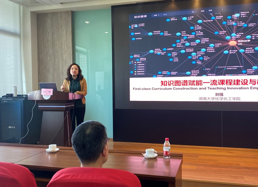 随后,刘强作题为“知识图谱赋能一流课程建设和教学创新”的精彩报告。他从教育数字化转型和知识图谱、知识图谱构建及其关系辨析、知识图谱如何赋能一流课程建设、知识图谱如何赋能混合式教学创新,四个主要方面进行了详细的介绍和分享。同时引用大量的案例和数据,展示了知识图谱在化学化工领域的应用和效果,引发了现场教师的强烈共鸣和热烈讨论。他还介绍了湖南大学化学化工学院在知识图谱方面的探索和实践,包括建立了化学化工知识图谱平台、开发了基于知识图谱的智能教学辅助系统、推进了基于知识图谱的混合式教学模式等。他鼓励澳门电子pg游戏官网的教师积极利用知识图谱,创新教学方法和学习方式,提升教学质量和学习效果。