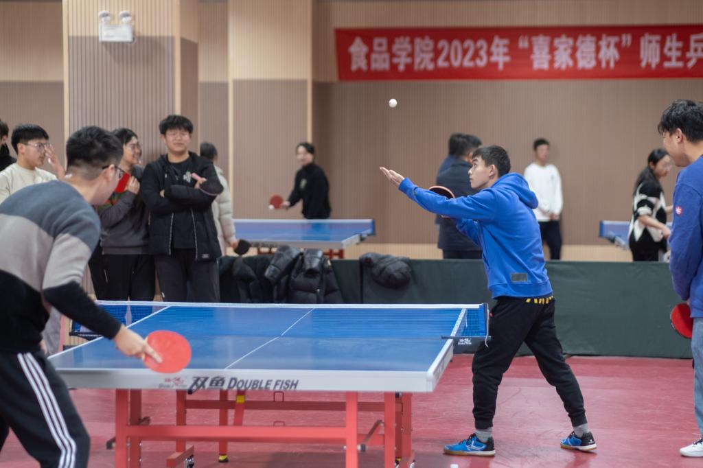 共有6支研究生队伍、8支本科生队伍参赛,14名教工分别加入其中一支队伍。比赛采用男单、女单、男双、女双、混双五场对抗赛的形式比拼团体竞技水平。比赛伊始,选手们便迅速进入状态,师生配合妙球频出,张驰之间展现昂扬姿态,一攻一守尽显食品风采。
