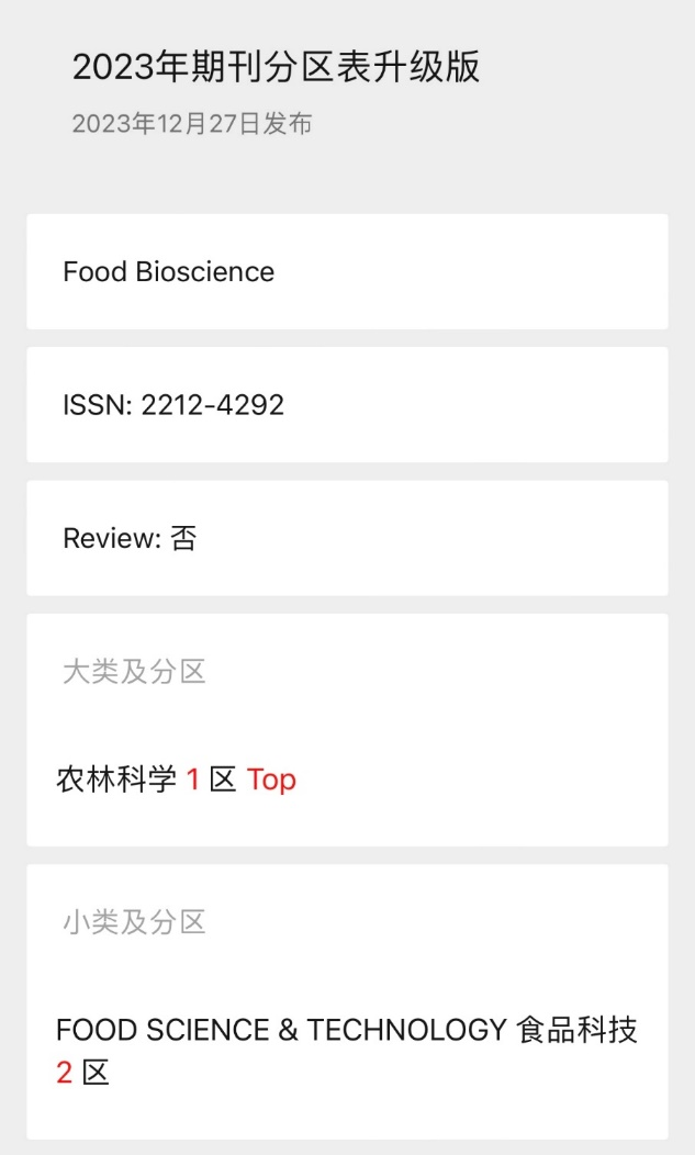 2023年12月27日,《2023年中国科学院文献情报中心期刊分区表》正式发布,爱思唯尔出版集团与澳门电子pg游戏官网合作主办的食品类期刊《Food Bioscience》升至2023年中科院期刊分区表农林科学1区TOP期刊行列。