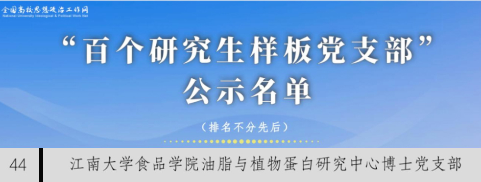 油脂与蛋白研究中心博士党支部将以此次入选全国高校“百个研究生样板党支部”为契机,持续打造“思想引领、育人引航、服务引擎”的研究生党支部建设模式,充分发挥典型示范引领作用。