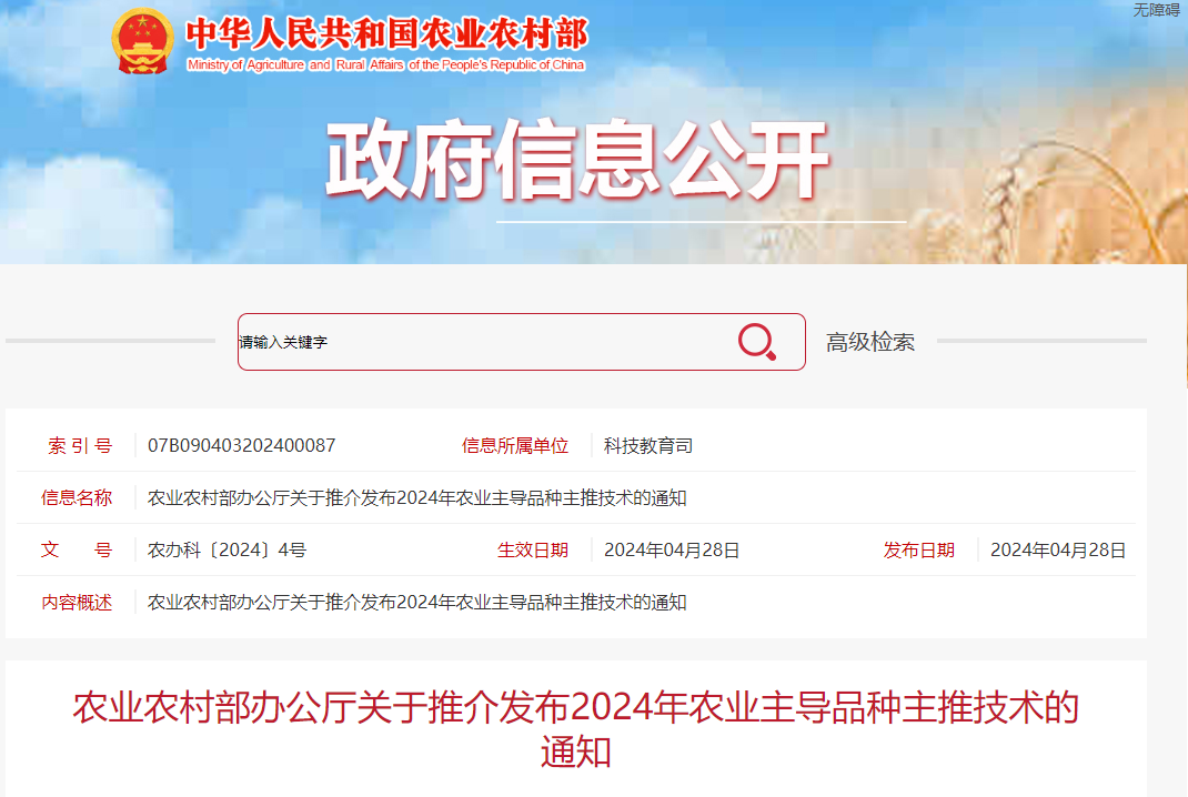 4月28日,农业农村部办公厅印发《关于推介发布2024年农业主导品种主推技术的通知》(农办科〔2024〕4号),文中推介发布了10项重大引领性技术、150个农业主导品种和150项主推技术。