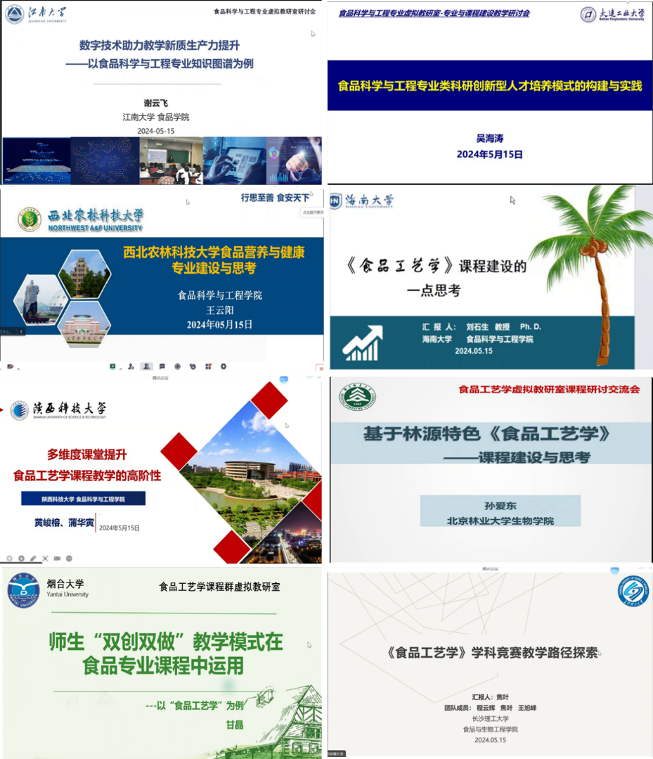 本次研讨会分为专业建设和课程群建设两个主题。在专业建设主题研讨中,澳门电子pg游戏官网谢云飞副院长、西北农林科技大学王云阳副院长和大连工业大学吴海涛副院长分别做了题为“数字技术助力教学新质生产力提升-以食品科学与工程专业知识图谱为例”、“西北农林科技大学食品营养与健康专业建设与思考”和“食品科学与工程类专业科研创新型人才培养模式的构建与实践”的分享报告。随后,北京林业大学孙爱东教授、陕西科技大学蒲华寅教授、海南大学刘石生教授、石河子大学程少波副教授、东北林业大学李德海副教授、烟台大学甘晶副教授、长沙理工大学焦叶副教授围绕食品工艺学课程建设分别做了题为“基于林源特色《食品工艺学》课程建设与思考”、“多维度课堂提升食品工艺学课程教学的高阶性”、“《食品工艺学》课程建设的一点思考”、“专业认证背景下“食品工艺学”课程的建设与探索“、“《植物产品加工工艺学》实验课程改革与探索”、“师生“双创双做”教学模式在食品专业课程中的应用-以食品工艺学为例”、“《食品工艺学》学科竞赛教学路径探索”7场主题报告。此次研讨会持续三个多小时,引起了与会专家和老师的热烈反响,他们表示,通过本次研讨会,开阔了眼界、拓展了思路,学习到很多宝贵的专业建设和课程建设的经验和方法,对于提升食品专业的教学质量将起到极大的帮助作用。