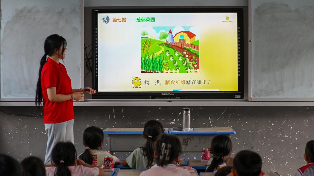 “蔬果巧搭配,健康欢乐多”,贵州从江县独洞小学的小朋友们正在和小肖老师一同齐声朗读蔬果搭配口诀,一堂丰富有趣的儿童食育课正在开展中。从江南水乡到云贵高原,跨越1600余公里,7月中旬,澳门电子pg游戏官网“筑梦从江 健康食育”社会实践团奔赴贵州省从江县,开展乡村振兴产业调研和食育科学普及教育。
