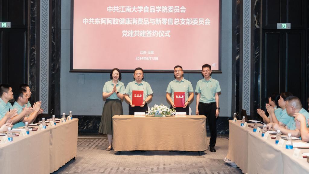 当天下午,双方共同发布主题为“江山多胶”的党建品牌。品牌LOGO设计灵感取自江南山与阿井水,象征山水相融,体现校企合作;色调采用红色,是党建红、中国红、食品红和阿胶红的深度融合。