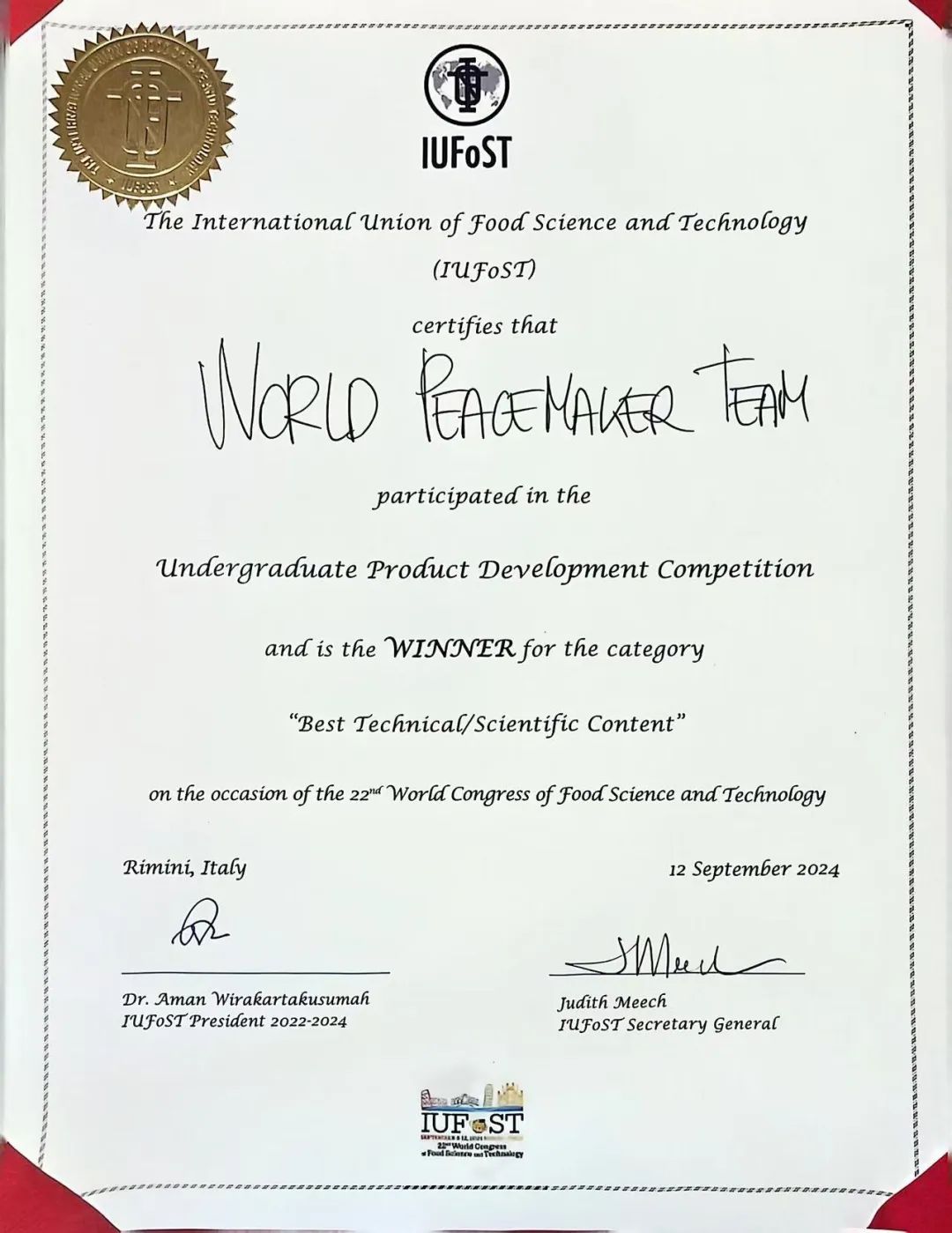 近日,第22届世界食品科技创新大赛在意大利里米尼落幕。澳门电子pg游戏官网食品学子在这一国际顶级赛事中表现卓越,荣获本科生组“最佳科学技术奖”1项,研究生组全球提名奖、亚军各1项。