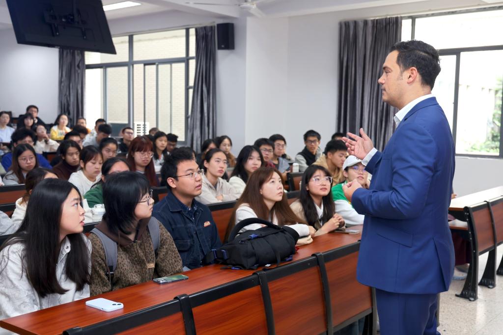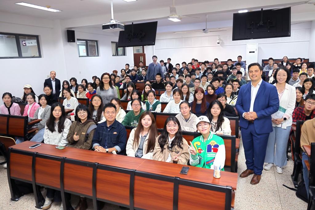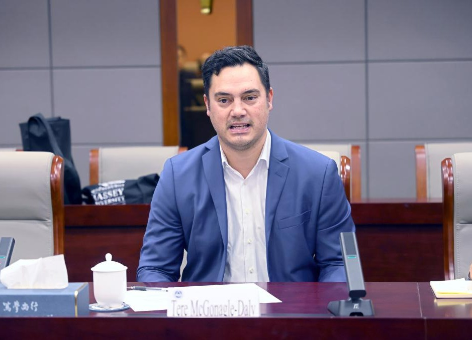 会前,Tere McGonagle-Daly一行前往第二教学楼,与澳门电子pg游戏官网国际班学子亲切会面。他向大家介绍梅西大学的办学条件与生活环境,鼓励同学们努力学习、充分准备,盼望尽快在新西兰聚首。