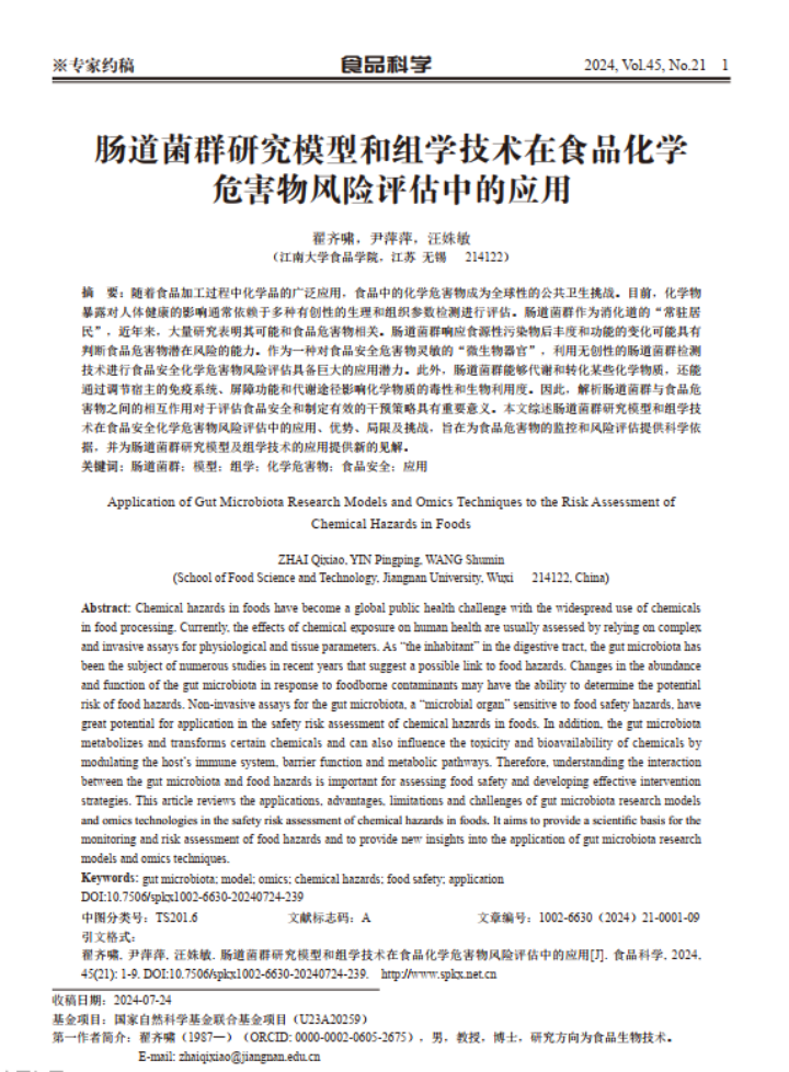 翟齐啸,尹萍萍,汪姝敏.肠道菌群研究模型和组学技术在食品化学危害物风险评估中的应用.食品科学, 2024, 45(21):1-9. https://doi.org/10.7506/spkx1002-6630-20240724-239