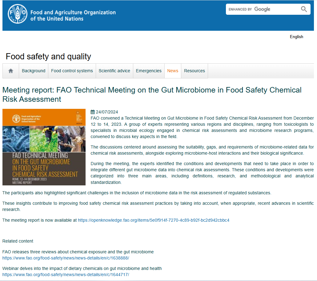 FAO. 2024. FAO technical meeting on the gut microbiome in food safety chemical risk assessment–Rome,12–14 December 2023, meeting report. Food Safety and Quality Series, No. 26. Rome. https://doi.org/10.4060/cd1399en